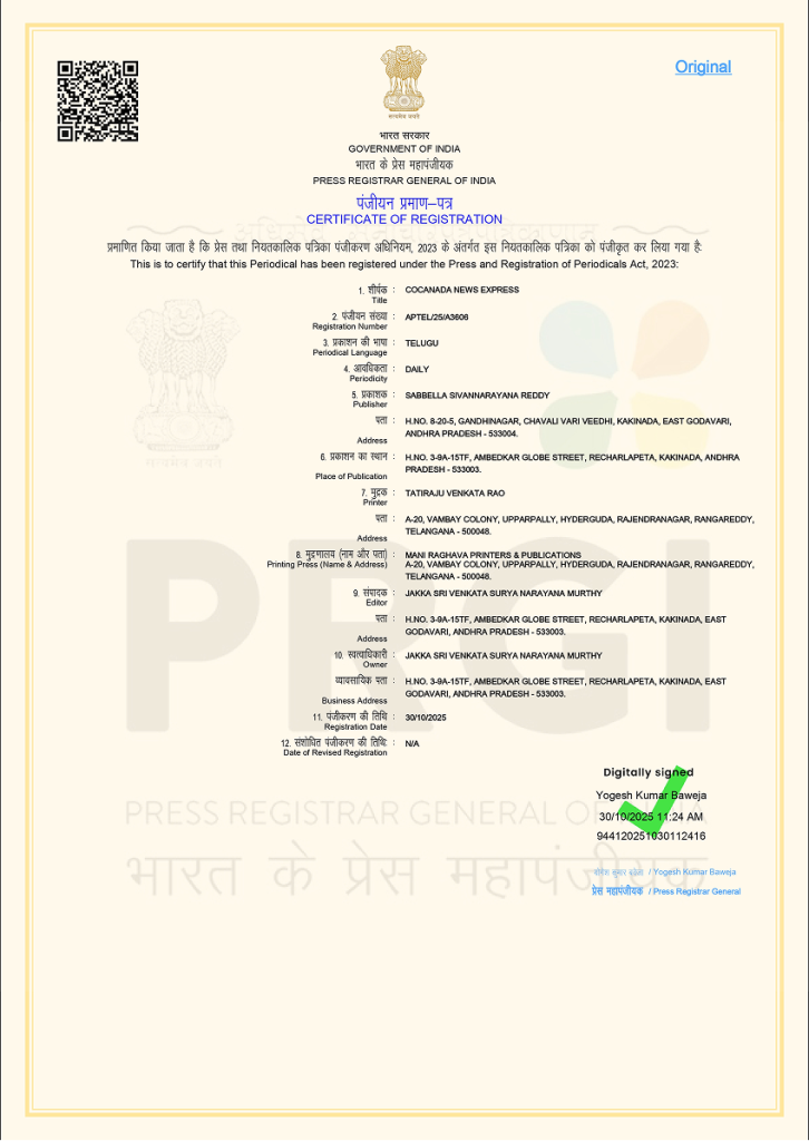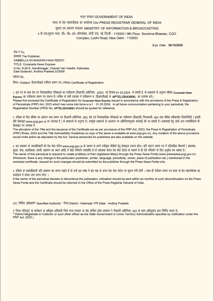 ప్రతిబింబించే స్థానిక దినపత్రికగా కోకనాడ న్యూస్ ఎక్స్ప్రెస్ ప్రారంభమైంది.